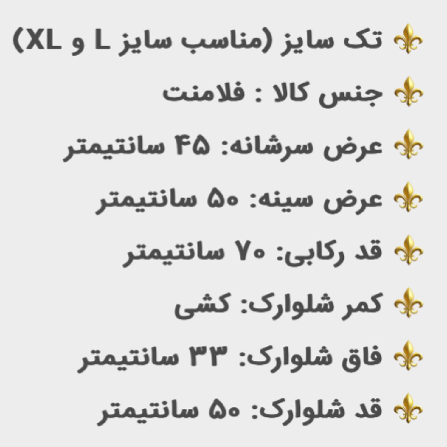 مشخصات سایز: فری سایز L تا XL