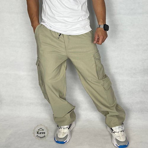 شلوار مردانه مدل کارگو دمپا بند دار بژ خاکی